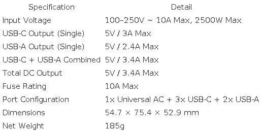 Combined Output (USB-C + USB-A): 5V/3.4A Max