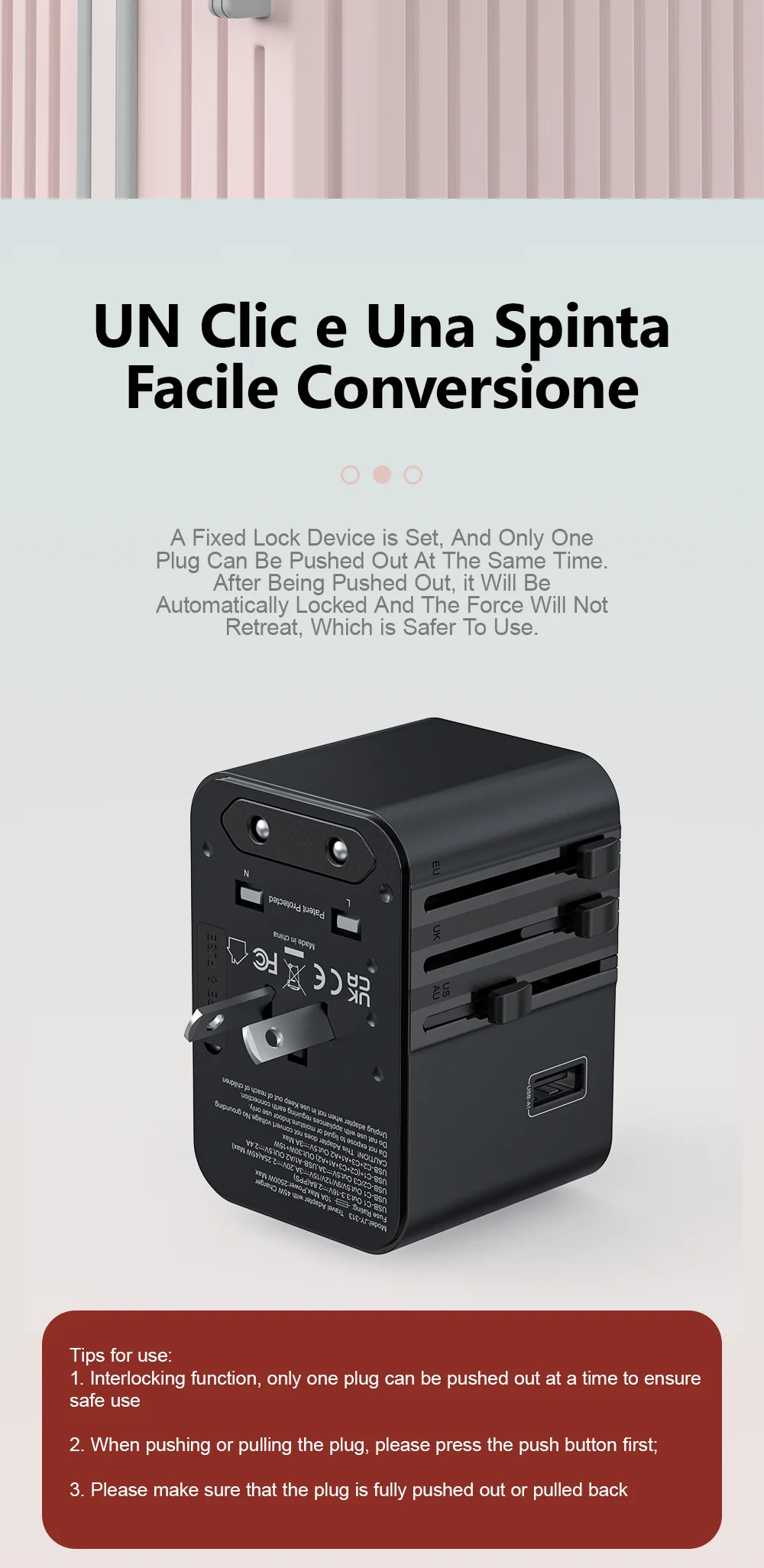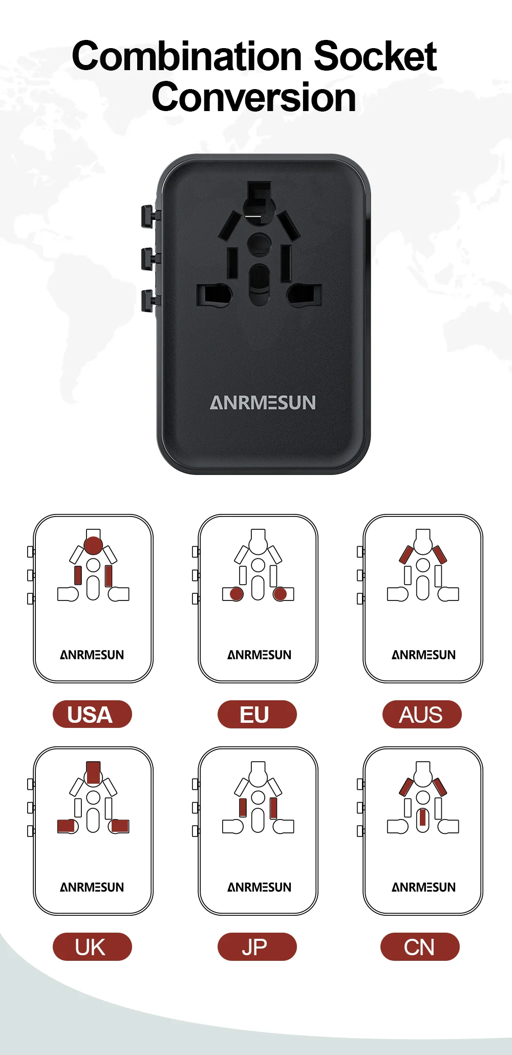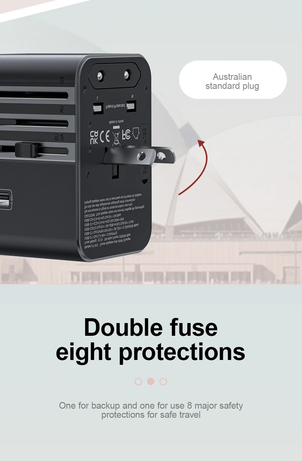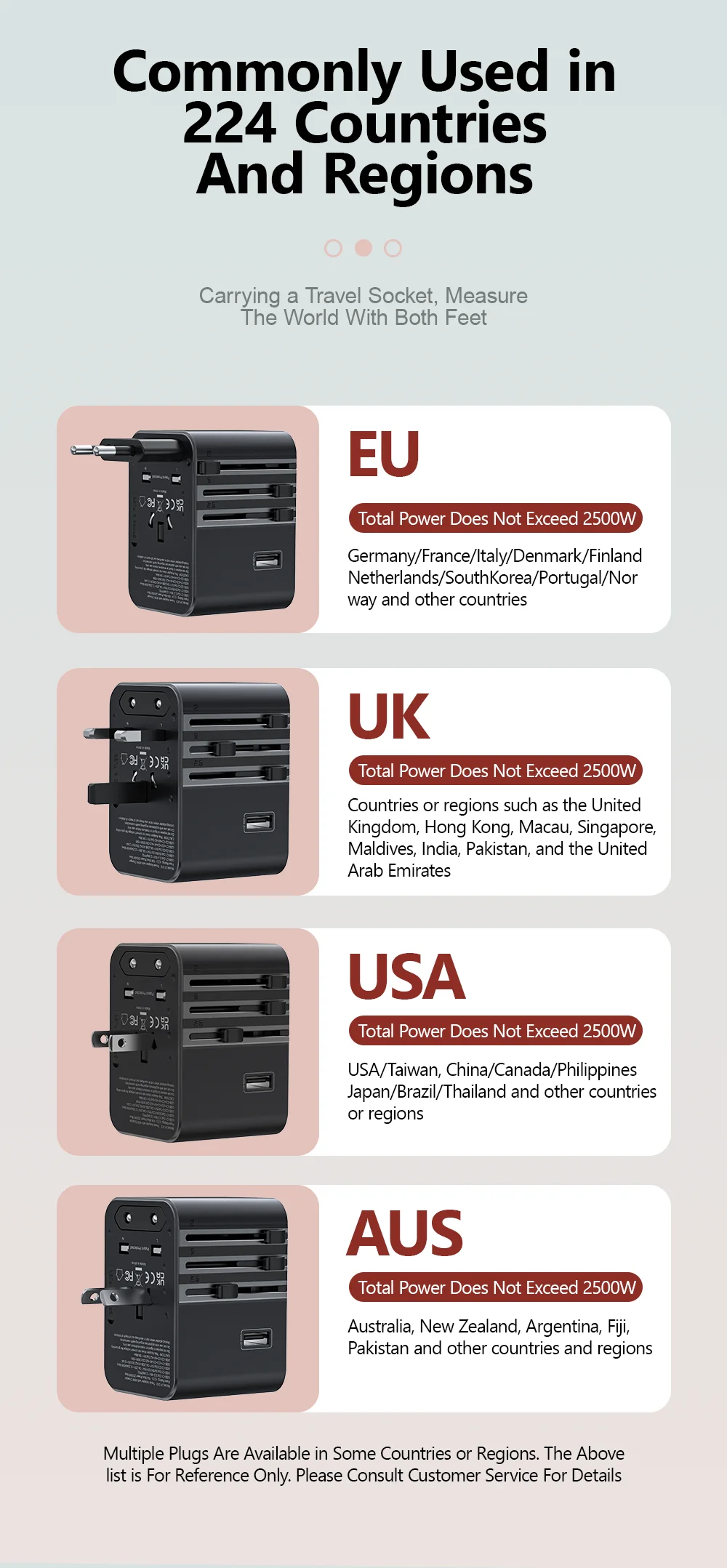 Compatible with international plugs including EU, UK, US, and AU standards.