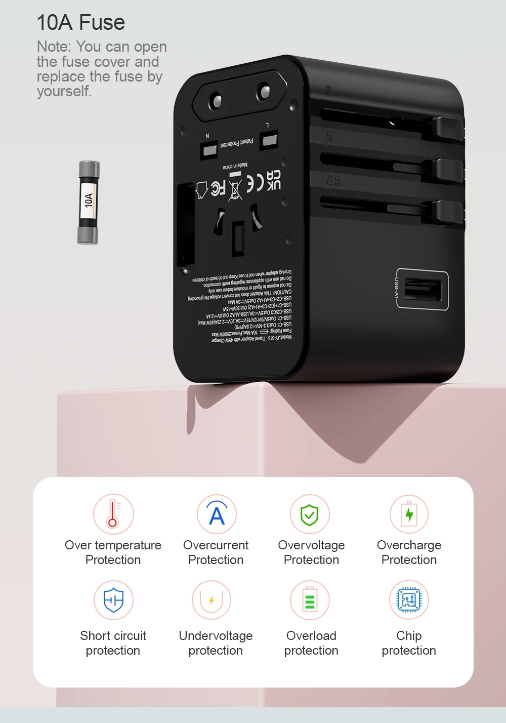 Built-in 10A Fuse — prevents overload and ensures safe operation